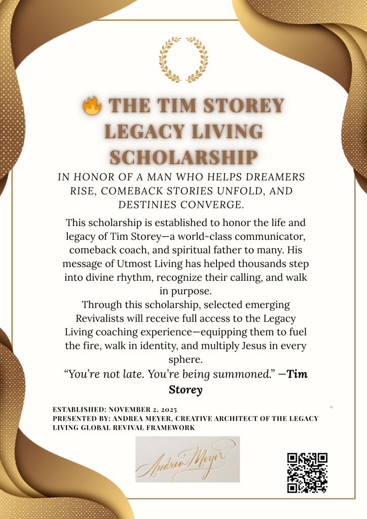 Presented in San Diego at Tim Storey’s birthday celebration by our son, Michael, this scholarship commissions Revivalists to build legacy—with fire, humility, and generational significance.